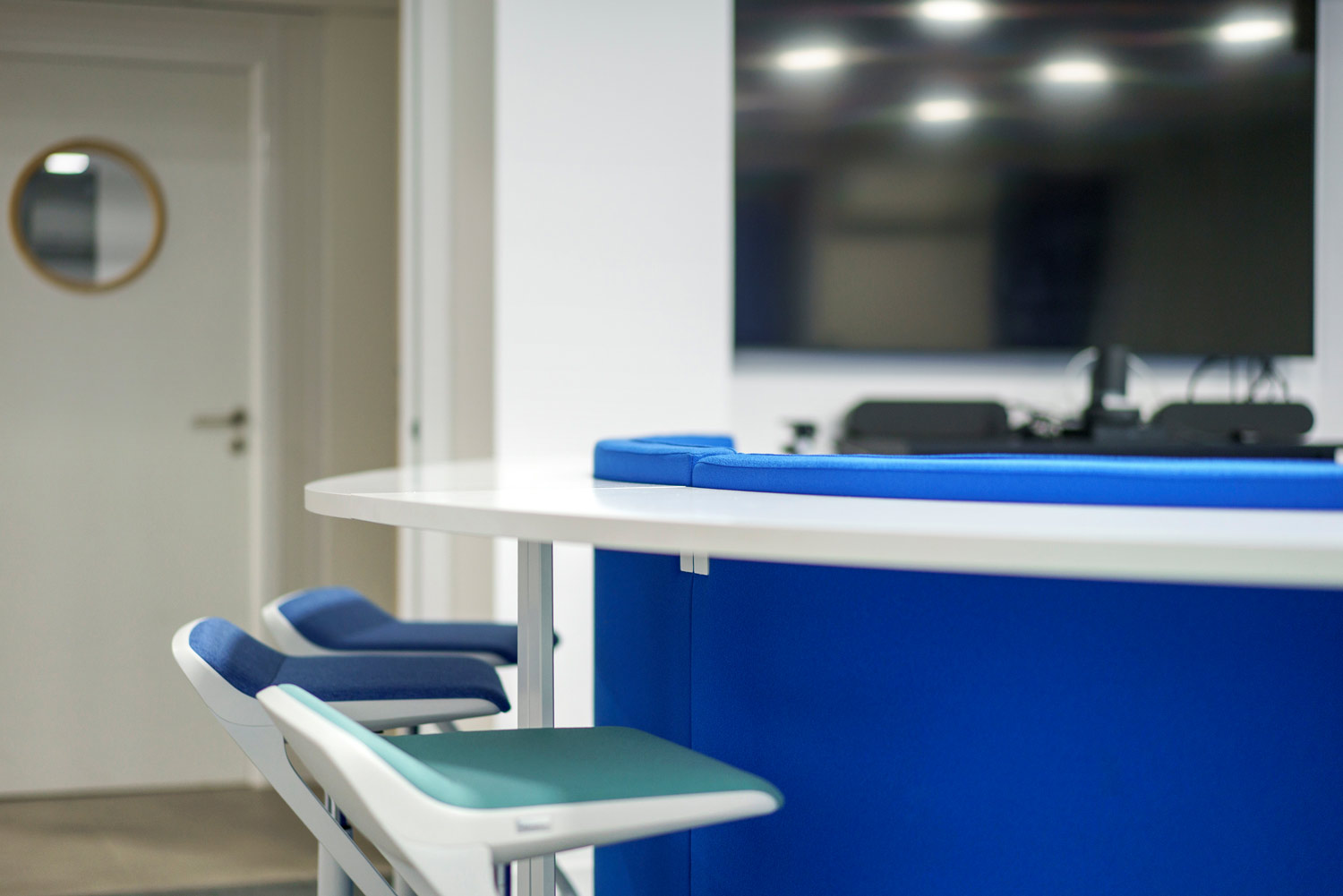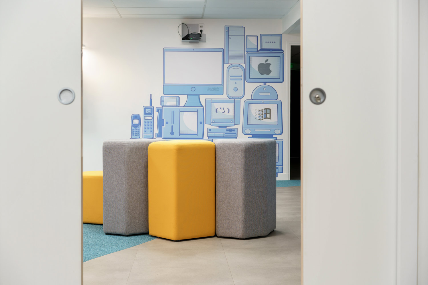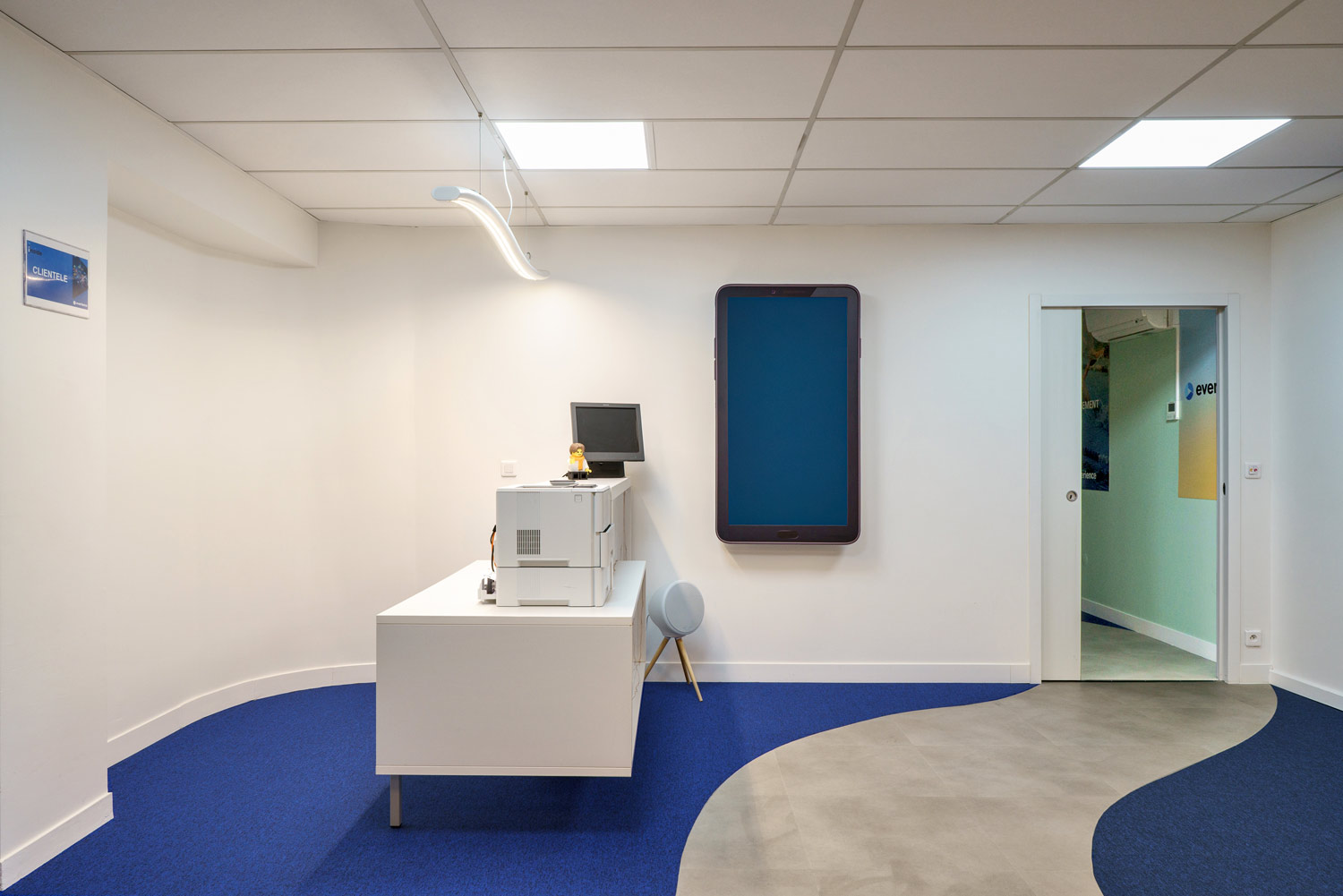 Transformation d’un espace de bureaux classiques en parcours immersif client. Réflexion, étude, proposition de plans et visuels 3D, curage, travaux, mobilier.