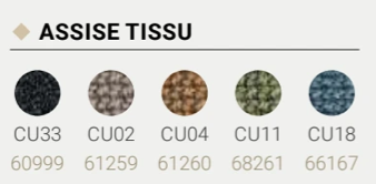 | Couleur Assise Siège | Réglisse (CU33), Plomb (CU02), Cannelle (CU04), Pistache (CU11), Bleu Horizon (CU18) |