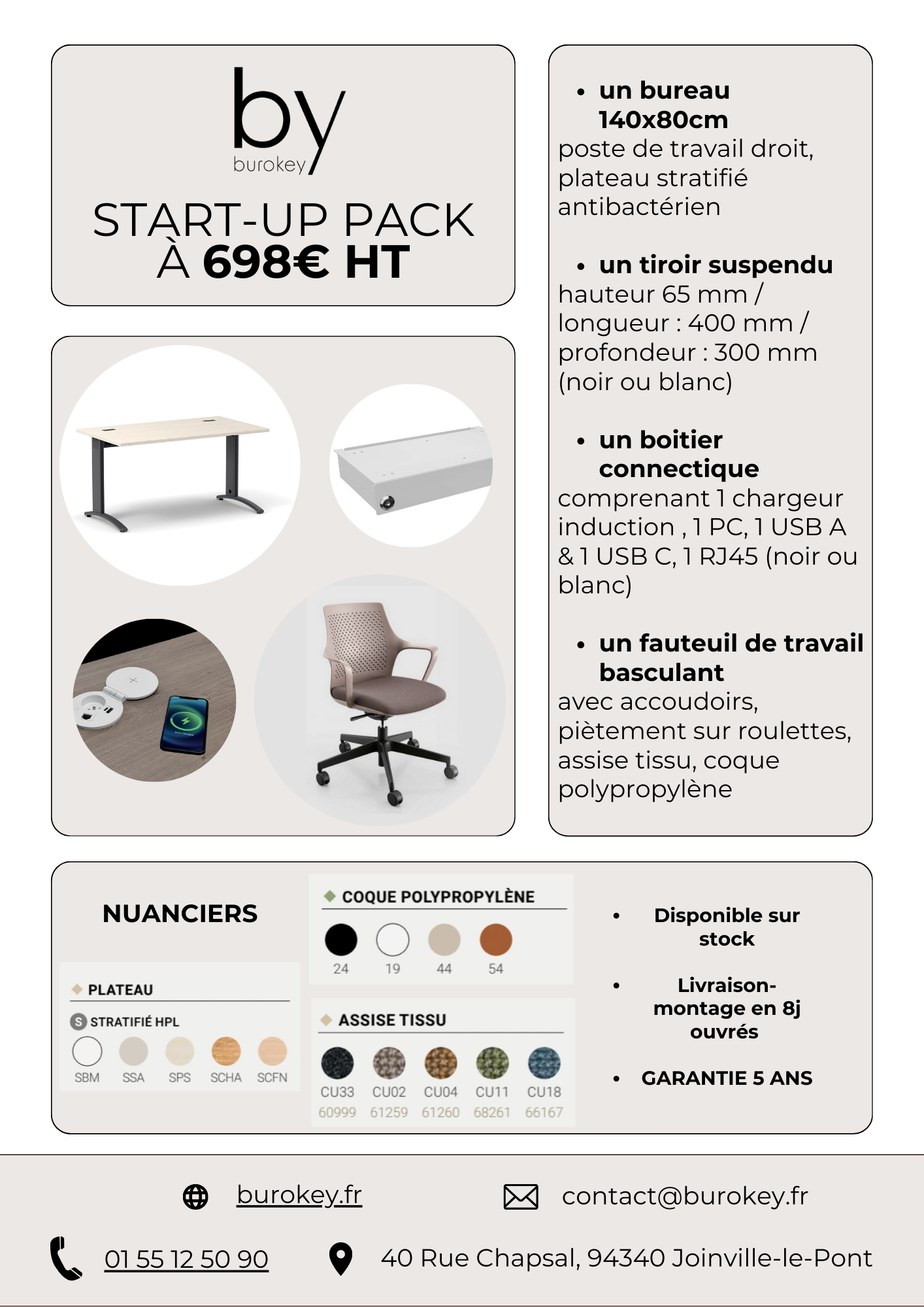 La solution Burokey pour jeunes entreprises (ou particuliers) pour un poste de bureau complet prêt à l’emploi, livré (et monté) en 8 jours ouvrés : le Pack Start-Up.