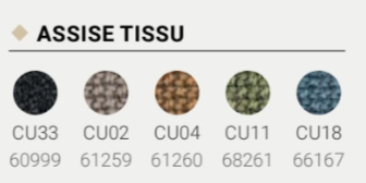 | Couleur Assise Tissu | Réglisse (CU33), Plomb (CU02), Cannelle (CUO4), Pistache (CU11), Bleu Horizon (CU18) |